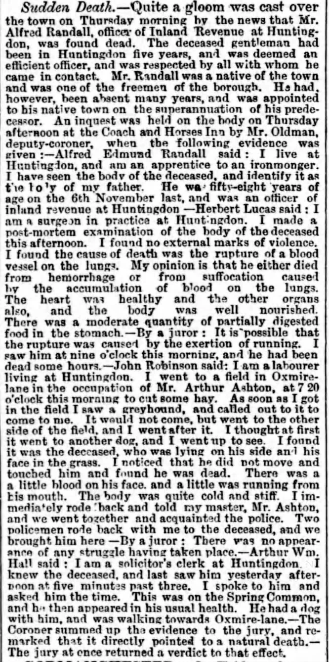 This article describes how Alfred’s body was found in a field in Huntingdon with his loyal greyhound dog by his dog. The body was then brought to a public house, in this case The Coach & Horses Inn, where the coroner held an inquest to determine the cause of death. It may sound strange to us today to hear that a dead body was brought into a pub, but that’s how it was often done in the past before towns had an official morgue or mortuary.