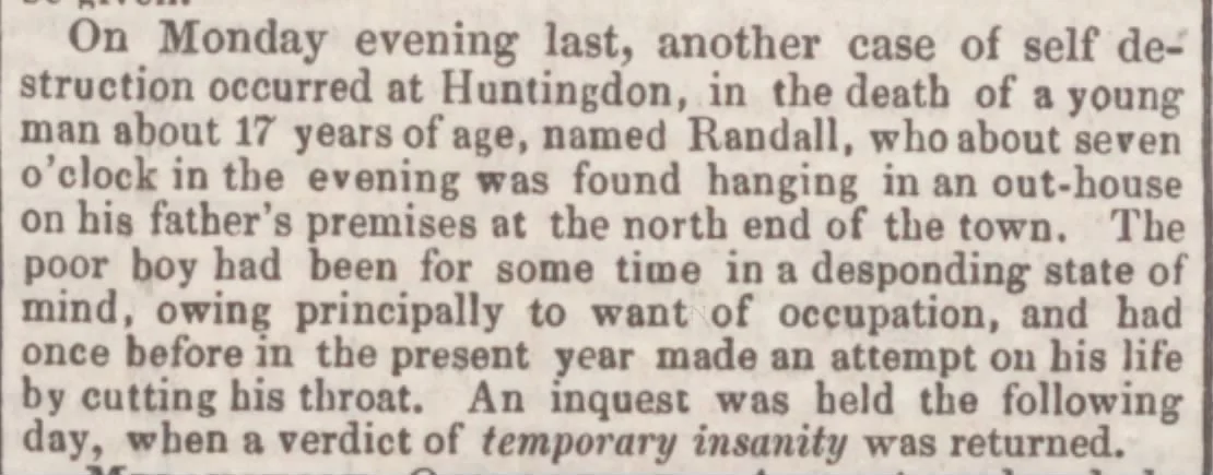 This Randall brother sadly never made it to adulthood. William (1825-1843) took his own life at the age of 17, reportedly due to “melancholy” and unemployment.(11) The cause of death was recorded as “hanging in a fit of temporary insanity.”(12) At this point in time, his father Charles was still alive and all of his siblings (except his oldest brother Charles Jr) were still residing in Huntingdon. This would have been a very dark chapter for the family.
