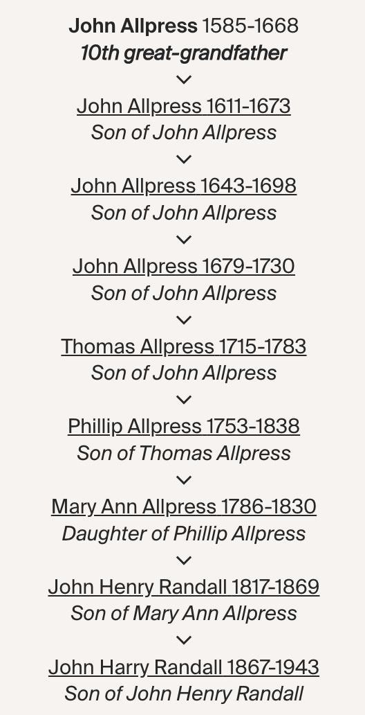 My Allpress to Randall line (Note: birth years are approximate when baptism records could not be found)