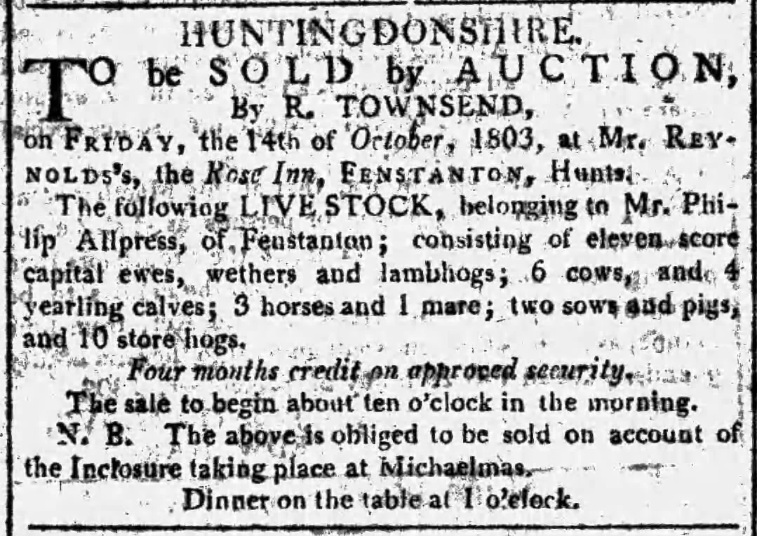 Livestock auction advertised in the Cambridge Chronicle and Journal, 8 October, 1803