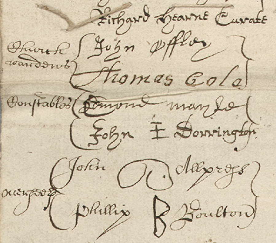 Excerpt from the Protestation Return for Huntingdonshire, Toseland Hundred, Fen Stanton (1641-1642). I think the mark of John Allpress, overseer, looks like a pair of spectacles. What do you think?